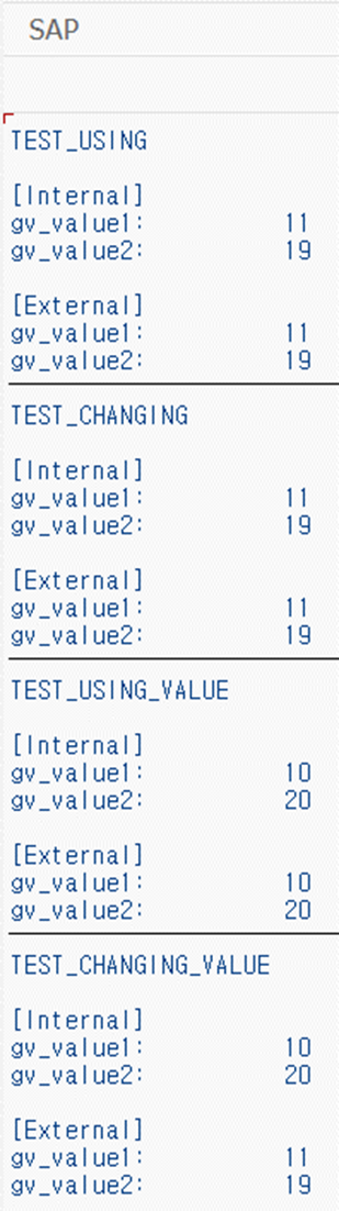 아래는 FORM 문으로 파라미터 사용시 gv_value 가 내부에서 동작하는 값과 FORM 문 종료 후 값을 표기